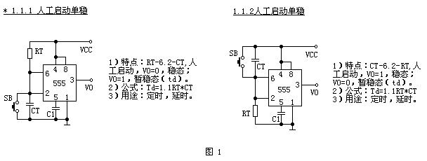 第1种(图1)是人工启动单稳,又因为定时电阻定时电容位置不同而分为2个不同的单元,并分别以1.1.1 和1.1.2为代号。他们的输入端的形式,也就是电路的结构特点是:“RT-6.2-CT”和“CT-6.2-RT”。