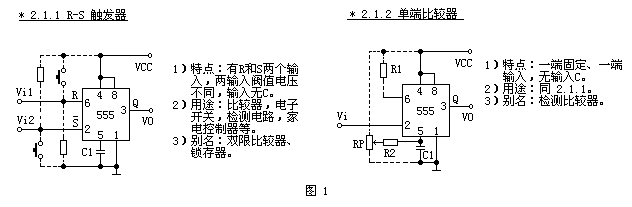 第一种(见图1)是触发电路,有双端输入(2.1.1)和单端输入(2.1.2)2个单元。单端比较器(2.1.2)可以是6端固定,2段输入;也可是2端固定,6端输入。