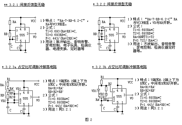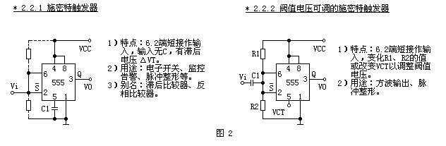 第2种(见图2)是施密特触发电路,有最简单形式的(2.2.1)和输入端电阻调整偏置或在控制端(5)加控制电压VCT以改变阀值电压的(2.2.2)共2个单元电路。