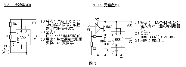 第三种(见图3)是压控振荡器。由于电路变化形式很复杂,为简单起见,只分成最简单的形式(3.3.1)和带辅助器件的(3.3.2)两个单元。图中举了两个应用实例。