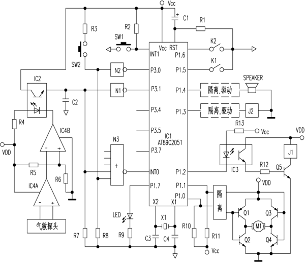 单片机采用中断查询工作方式。气敏传感器的信号经IC4A放大,使IC4B翻转,经光耦隔离向N3和N1输入的高电平,反相后N3触发中断0,单片机查到P31为低电平后,向P10、P11输出开窗指令,经隔离后,Q1~Q4驱动电机M1打开窗子;P2口由高转低,Q5导通,J1常开触点吸合,启动排风扇或空调等。C2可消除一定的干扰,以免误触发。为简化电路,图中只画出了一路传感器输入。P34、P35、P37分别接受来自热释电、湿敏、光敏探头的信号。SW2为多功能按钮,不按SW1时,SW2为手动开/关窗键;按一下SW1,触发中断1,进入设定时间方式,每按一下SW2设定时间增加半小时,停止按键30秒后设置结束,定时器开始工作;防盗报警被触发后,按一下SW2,可终止讯响器SPEAKER的鸣叫。K1、K2为窗子开闭到位检测开关,J2为窗锁电磁铁线圈,关窗到位后为窗子上锁。LED作多功能指示:上电后LED亮,指示处于初始延时(由于传感器的初始不稳定性,必须有较长时间的延时);设定时间时,每按一下SW2,LED闪烁一次,确认键输入有效;当气体检测动作后LED也点亮,其余时间均熄灭。