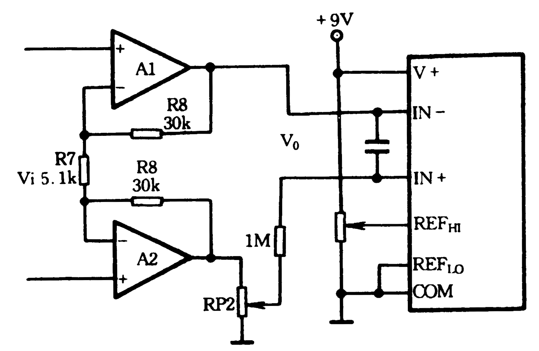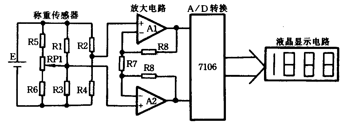 如果载荷P安放在秤盘上,载荷P简化为作用在弹性元件端部的一个力偶M,如图所示。这种传感器的特点是载荷P准S型传感器安放在任何位置都不影响输出值。根据这一特点,我们只要稍作修改就可以制成一个准S型传感器,修改后的结构如图所示。从图中可以看出,重力P的中心在中线上,这样S型传感器安放在手提秤的外壳中,重力P的中心也在外壳的铅垂中心线上。改装后的准S型传感器的电桥输出电压为V0。放大电路与7106的连接图如图所示,A1和A2组成对称型同相放大电路,输入电阻很高。由于结构对称,在输出端它们的温度漂移被相互抵消。
