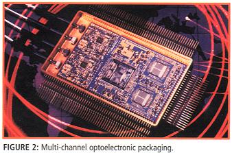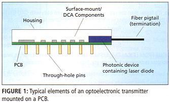 这个“另类世界”由古怪的基板和封装设计组成,在其内面有细小的、精致的光子元件。通常为了稳定性,光子元件装在气密密封的封装里面,例如,在晶体管外形(TO)头中的激光二极管。光电子元件连接以形成电路的安装结构可以是柔性电路、FR-4板或几种其它的连接材料。一个例子是在FR-4板上的电信阵列放大器,然后板又浇铸成模块。另一个例子是在PCB上的光电发射器(图一)。