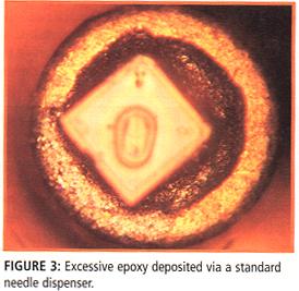 如果要使用树脂,树脂点的大小必须比具有正向位移阀的标准针嘴滴胶系统可达到的更小。这类系统滴出的胶点就象俗话说的“黑人的蜜吻”,对于VCSEL应用简直太大了。由于胶点太大,当放置元件时材料流出边缘周围,流到激光元件的发射区域,阻碍发射的光束(图三)。