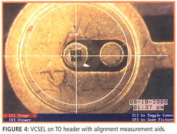 为了解决这些问题,可以将一个相对不昂贵的视觉图像标识器加入到激光绑定机上。这个视觉图形标识器由一个键盘、控制箱和调节系统的放大电子图像的x-y旋钮组成。视觉图像标识器产生一个固定的十字线图形重叠,用于对中VCSEL的发射点。不同的图像然后可以叠加在VCSEL将要安装的子装配上。例如,TO头的顶部的外圆的叠加图像。