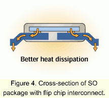 small-outline)元件的倒装晶片封装设计的优点是以电气和热性能的形成表现的。在热性能方面,当与一个引线接合的元件比较时散热好得多,这是由于大的横截面和通过锡球所提供的良好导热性(图四)。热量直接从芯片的有源边通过金属导线传导到印刷电路板(PCB,