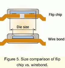 使用倒装晶片技术可以使工程师能够将较大的芯片包装到与传统的引线接合封装相同的封装面积中(图五)。那么,在导线框上引线接合(wirebond)和在晶片周围渗出的树脂所要求的空间,可以用于较大的芯片尺寸。这为封装设计者提供了几个机会,比如在相同的元件内增加更多的功能而不需要改变封装的类型或尺寸。这就变成两种方式的成本节约:相同的封装有更多的功能,并且使用相同封装意味着没有变化和在PCB面上相同的表面面积。