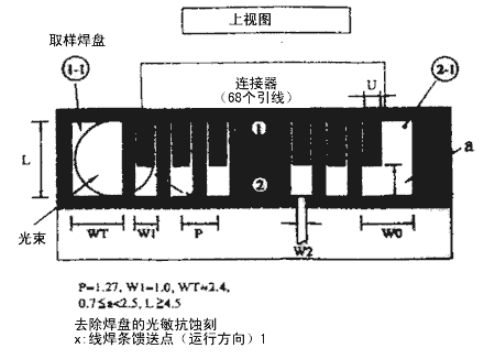 对于使用图5a中的线焊条连续进料焊接电路板的设计理念见图5的说明。在图5中,(1)和(2)是光束照射方向,当光束照射到(1)和(2)时,开始在照射的焊盘上进行焊接,分别表示为(1-1)和(2-1)。W2是图形宽度。图5中实例的引线间距为P-1.27,(0.050")。电路板设计的关键几点如下: