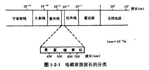 由此可见,光的波长与频率成反比。实际上光波只占整个电磁波波段的很小一部分,见图1-2-1。