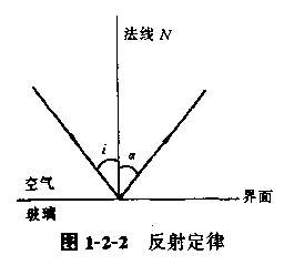 ②人射角和反射角相等。如图1-2-2所示,入射光线与法线N的夹角记为入射角,用i表示;反射光线与法线N的夹角记为反射角,用α表示。则有i=α。光的反射现象还具有可逆性,假如光线逆着原来反射光线方向入射到界面上,那么它将逆着原来入射光线的方向反射出去。