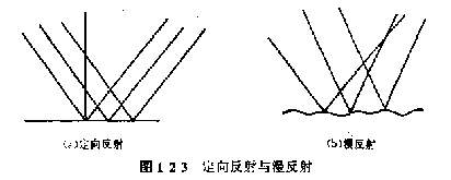 随着界面的不同,反射又可分为定向反射和漫反射。从一个方向入射到光亮、平整的镜子上的光线,入射点都落到同一平面上,其反射都向着同一方向,如图1-2-3(a)所示,则称为定向反射。当光从一个方向投射到粗糙表面上时(如毛玻璃面等),由于粗糙面可以看成由许多角度不同的小平面组成,光线便从各个不同的方向反射出去,称为漫反射,如图1-2-3(b)所示。但需注意在漫反射现象中,就每一条光线而言都还是遵循反射定律的。