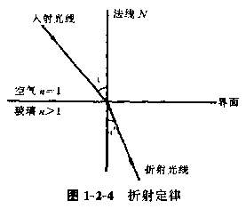 (4)光的折射定律 当光传播到两种不同的介质(如水、玻璃)的分界面上时,在产生光的反射的同时,将有一部分光线射入到另一介质中,其传播方向随介质的密度大小而发生改变,这种光的偏折现象称为光的折射。我们称这两种介质的分界面为折射面。从折射面进入新的介质,并且传播方向发生改变的光线称为折射光线。折射光线和法线所构成的角称为折射角,记为i’,如图1-2-4所示。介质所固有的并和其密度及所通过光线的波长有关的特征量称为介质的折射率,通常用n表示。它反映了光从真空射入某种媒质发生折射的时候,入射用i的正弦跟折射角i’的正弦之比。折射率的大小表明媒质的折光能力的大小,n值越大表明折光能力越大。光的折射定律指出: