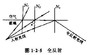 由此可见,当光线从光疏介质进入光密介质时,折射角 i’<入射角i,折射光线靠近法线;反之折射光线远离法线。在后一种情况下,当入射光线以某一特定角度α入射时,折射角i’将等于90°,角α就称为临界角。当入射光线以大于临界角的方向射到界面上时,将全部被反射而不再发生折射,这种现象称为全反射现象,如图1-2-5所示。