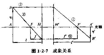 物体AB到H的距离称为物距,记作l。同样,H'到A'点的距离称为象距,记为l'。从图1-2-7中我们用简单的相似三角形关系,即可得出物距l、象距l'和焦距f'之间的关系为