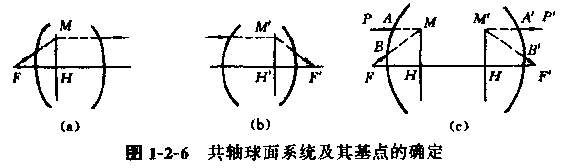 作物空间焦点F发出光线的延长线(图1-2-6),并且将象空间相应的平行光线向反方向延长,于是此两延长线(虚线)交于M点,通过M点作光轴的垂直平面MH,称为系统物空间的主平面,主平面与光轴的交点H,称为系统物空间的主点。反之可得系统象方主平面M'H'和象方主点H'。