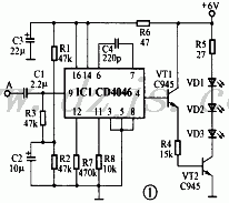 接收与发射电路中两只CD4046的中心频率均为45kHz,故R7与R17、R8与R18、C4与C24的参数必须严格对应相等。驱动红外发光管的三极管VT1与VT2均工作在放大状态,其Vbe约0.6V;VT1与VT2也可用9013替换,但管子的β应大于100。发射电路的电源在图中没有标出,制作时可用LM7806稳压后获得。