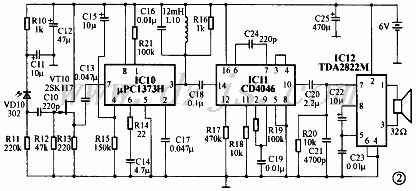 接收器由光电转换、脉冲放大、频率解调及音频放大四部分组成,接收器电路如图2所示。经调制的红外信号首先被红外光敏管接收并转换为调频电信号,经过场效应管2SK117预放大,μPC1373H选频、放大后再由CD4046构成的鉴相电路解调并还原为音频信号。