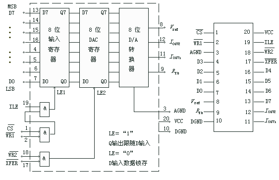 D/A转换器可以视为微机的一种外围设备,实现D/A转换器和微机接口技术的关键是数据锁存问题。当CPU向D/A转换器输出一个数据时,这个数据在数据总线上只持续很短的时间,必须有数据锁存器锁住这个数据,才能得到持续稳定的模拟量输出。有些D/A转换器芯