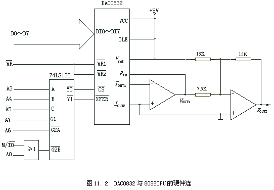 11. 2是DAC0832与8086CPU的硬件连接图。CPU通过低8位数据线与DAC0832通信,DAC00832接成双缓冲工作方式,口地址为80H~86H中的偶地址和88H~8EH中的偶地址。