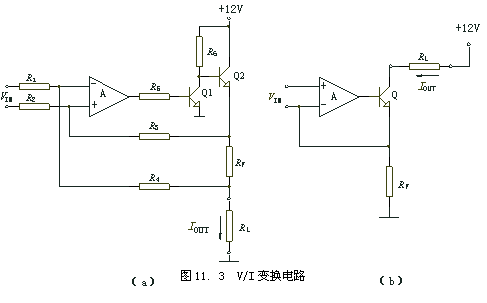 图11. 3给出了两种典型的电压/电流转换基本电路。图中A为运算放大器。Q和Q2为中功率三极管,RF为反馈电阻,RL为负载电阻,VIN为转换输入电压,IOUT为输出电流。