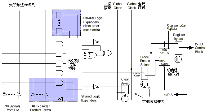 左侧是乘积项阵列,实际就是一个与或阵列,每一个交叉点都是一个可编程熔丝,如果导通就是实现“与”逻辑。后面的乘积项选择矩阵是一个“或”阵列。两者一起完成组合逻辑。图右侧是一个可编程D触发器,它的时钟,清零输入都可以编程选择,可以使用专用的全局清零和全局时钟,也可以使用内部逻辑(乘积项阵列)产生的时钟和清零。如果不需要触发器,也可以将此触发器旁路,信号直接输给PIA或输出到I/O脚。