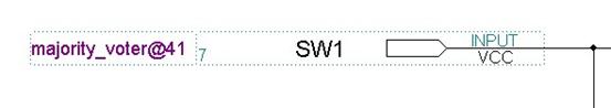 下图为SW1放大的图,其中majority_voter@41中前部分为设计的文件名,后面41为EPM7128SLC84-15的41脚,也就是说电路图中SW1被指定到EPM7128SLC84-15的41脚(而实验板上41脚被连接到指拨开关SW1上了,这样电路图上SW1就和实验板上的硬件SW1实现了连接)。