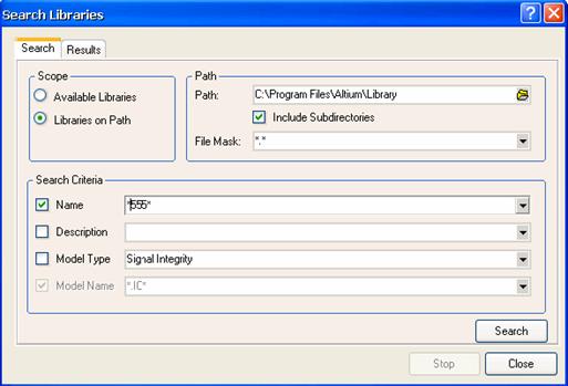 ( 4 )在 Seach Criteria (搜索标准)选项区域中可以使用 Name 、 Description 、 MdelType 、 Model Name 组合来说明要搜索的元件,例如要搜索和 555 元件相关的可以在 Name 文本框中键入 *555* 。