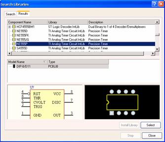 可以看到很多匹配搜索标准的芯片型号,选择一款适合的元件原理图符号和封装。这里选择元件 NE555P ,属于 TI Analog Timer Circuit . IntLib 库。能否找到所需要的元件关键在于输入的规则设置是否正确,一般尽量使用通配符以扩大搜索范围。