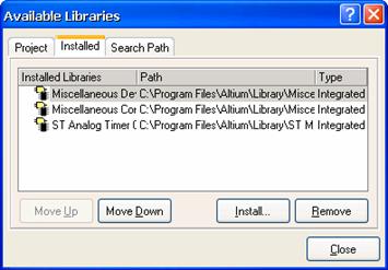 ( 1 )在如图 3 — 6 所示对话框中单击 Libraries 按钮,弹出如图 3 — 8 所示对话框,其中 Ordered List of Installed Libraries 列表框中主要说明当前项目中安装了哪些元件库。