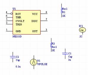 下面放置两个电阻、两个电容、脉冲电压源( VPULSE )和静态电压源( IC ),其步骤如下: