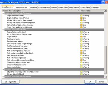 Error Reporting 用于报告原理图设计的错误,主要涉及下面几个方面: Violations Associated with Buses (总线错误检查报告)、 Violations Associated with Components (元件错误检查报告)、 Violations Asociated with Documents (文件错误检查报告)、 Violations Associated with With Nets (网络错误检查报告)、 Violations Associated with Others (其他错误检查报告)、 Violations Associated with Prarmeters (参数错误检查报告)。对每一种错误都设置相应的报告类型,例如选中 Bus indices out of range ,单击其后的 Fatal Error 按钮,会弹出错误报告类型的下拉列表。一般采用默认设置不需要对错误报告类型进行修改。