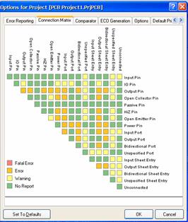 例如在矩阵图的横向找到 Output Pin ,从列向找到 Open Collector Pin ,在相交处是绿色的方块。当项目被编译时,这个绿色方块表示在原理图中从一个 Output Pin 连接到 Open Collector Pin 时将启动一个错误条件。