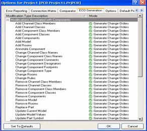 ECO ( Engineering Change Order ) Generation 主要设置与元件、网络和参数相关的改变,对于每种变换都可以通过 Mode 列表框的下拉列表中选择 Generate Change Orders (检查电气更改命令)还是 Ignore Differences (忽略不同)。