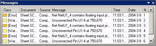 编译项目就是在设计文档中检查原理图的电气规则错误。执行菜单命令 Project / Compile PCB Project ,系统开始编译 Myproject1. PrjPCB 。当项目被编译时,在项目选项中设置的错误检查都会被启动,同时弹出 Message 窗口显示错误信息。如果原理图绘制正确,将不会弹出 Message 窗口。