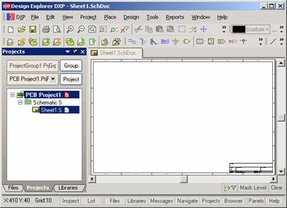 在完成了原理图工作环境的设置以后,出现如图 4-1 所示的空白原理图图纸界面。由于设置工作环境的不同,主菜单和主工具栏也可能会有所不同。