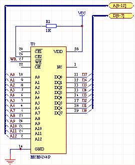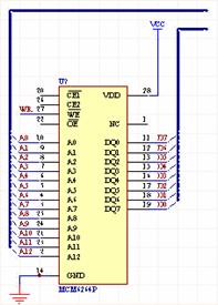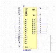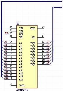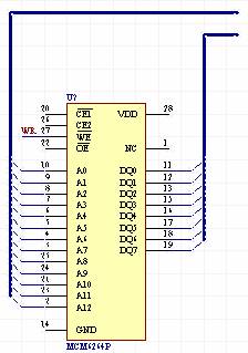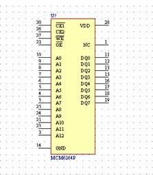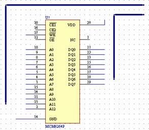 按照原理图工作环境的方法完成了一张空白原理图纸的设置。按照上述方法,实现了在原理图上放置元件 MCM6264CP 。放置元件 MCM6264CP 后的原理图如图 4-11 所示。