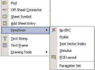 执行菜单 Place 下的各个菜单命令。这些菜单命令与电路图工具栏的各个按钮相互对应,功能完全相同。 Place 菜单下的画电路图菜单命令如图 4-14 所示。