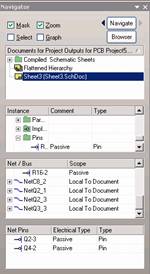 多个对象编辑中最简便的方法当属利用 `Navigator 面板来实现。利用 Navigator 面板可以浏览元件、网络、引脚等。首先打开任意一张电路原理图文件,单击原理图编辑器下方的 Navigator 按钮,将弹出 Navigator 面板如图 4-41 所示。