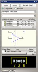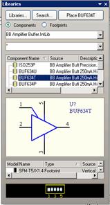 在图 4-5 中, Lbraries 选项下方有两个单选项, Components (元件)、 Footprints (封装)。选中 Components ,在装入的元件库栏中选中 BB Amplifier Buffer. IntLib ,过滤器栏采用通配符设置,则在对象库元件栏中显示该库所有的元件。例如选中对象库中的元件 BUF634T, 在对象元件原理图栏显示该元件的原理图符号。在元件封装和信号完整性分析栏中显示对应的该元件的封装和信号完整性分析。