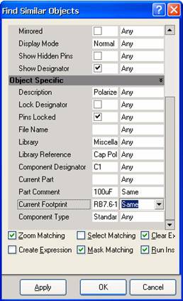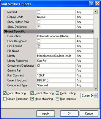 以图 4-42 为例,对与电容 C1 相匹配的多个对对象进行选择和编辑。对 Find Similar Objects 对话框采用如图 4-44 所示设置以搜索与电容 C1 相匹配的对象。选中 Zoom Matching 、 Select Matching 、 Clear Existing 、 Mask Matching 复选项、其他采用默认设置。