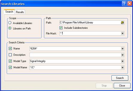 ● Search Criteria 区设置搜索元件的标准。如 Name 、 Description 、 Model Type 、 Model Name 。一般情况下设置元件名称进行搜索即可。例如想搜索 Motorola 公司的静态存储器 Mcm6264 ,那么就可以在搜索路径上设置 Altium\Library\Motorola ,在搜索元件名中键入 *6264* ,键入通配符是为了更好的搜索关于 6264 相关芯片的信息。一般在搜索元件时都需要键入通配符。如果不知道元件是什么公司的产品,在搜索路径中不设置公司名,仅设置 Altium\Library 即可。