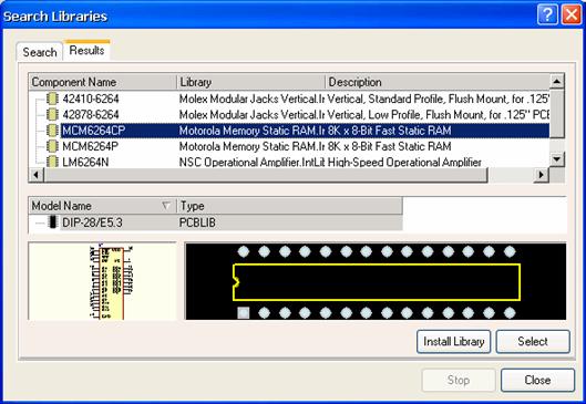 在搜索完元件 MCM6264CP ,并在当前项目中加载了 Motorola Memory Static RAM. IntLib 元件库后,单击 Close 按钮关闭搜索元件对话框。