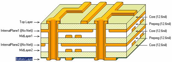 多层板的 Mid-Layer (中间层)和 Internal Plane (内层)是不相同的两个概念,中间层是用于布线的中间板层,该层均布的是导线,而内层主要用于做电源层或者地线层,由大块的铜膜所构成,其结构如图 5 — 1 所示。
