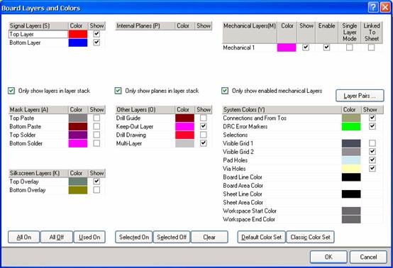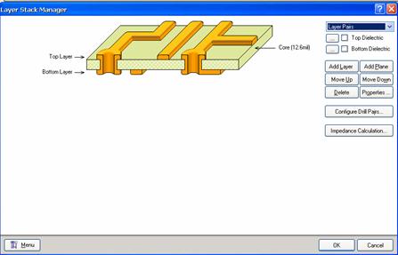 在图 5 — 1 中的多层板共有 6 层设计,最上面为 Top Layer (顶层);最下为 Bottom Layer( 底层 ) ;中间 4 层中有两层内层,即 InternalPlane1 和 InternalPlane2, 用于电源层;两层中间层,为 MidLayerl 和 MidLayer2 ,用于布导线。