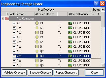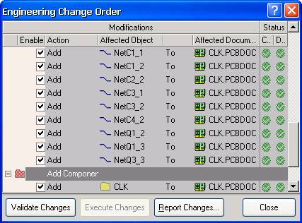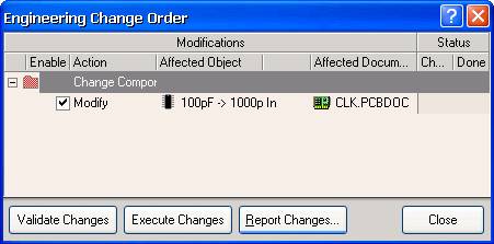 例如,在 SCH 原理图中将电容 C5 的电容值从 100pF 更改为 1000pF ,从 Protel DXP 的主菜单中执行 UpdatePCB CLK . PcbDoc 命令后,将弹出项目设计更改管理对话框,如图 5 — 79 所示。