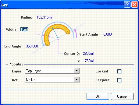 ● 对已经在 PCB 板上放置好的导线,直接双击该导线,也将弹出圆弧属性对话框。 圆弧属性对话框中有如下几项设置: